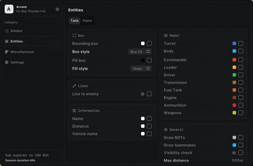 ESP-версия без аимбота для тех, кому нужен только визуальный функционал. 3D боксы, модель повреждений, дистанция и название техники.